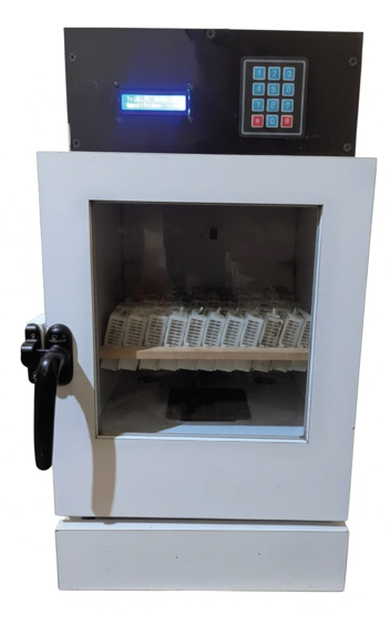 Smart incubator incubates bee brood (eggs, larvae, or pupae) for queen rearing. It operates from the power source 220 VAC, it contains 60 queen bee brood cells.